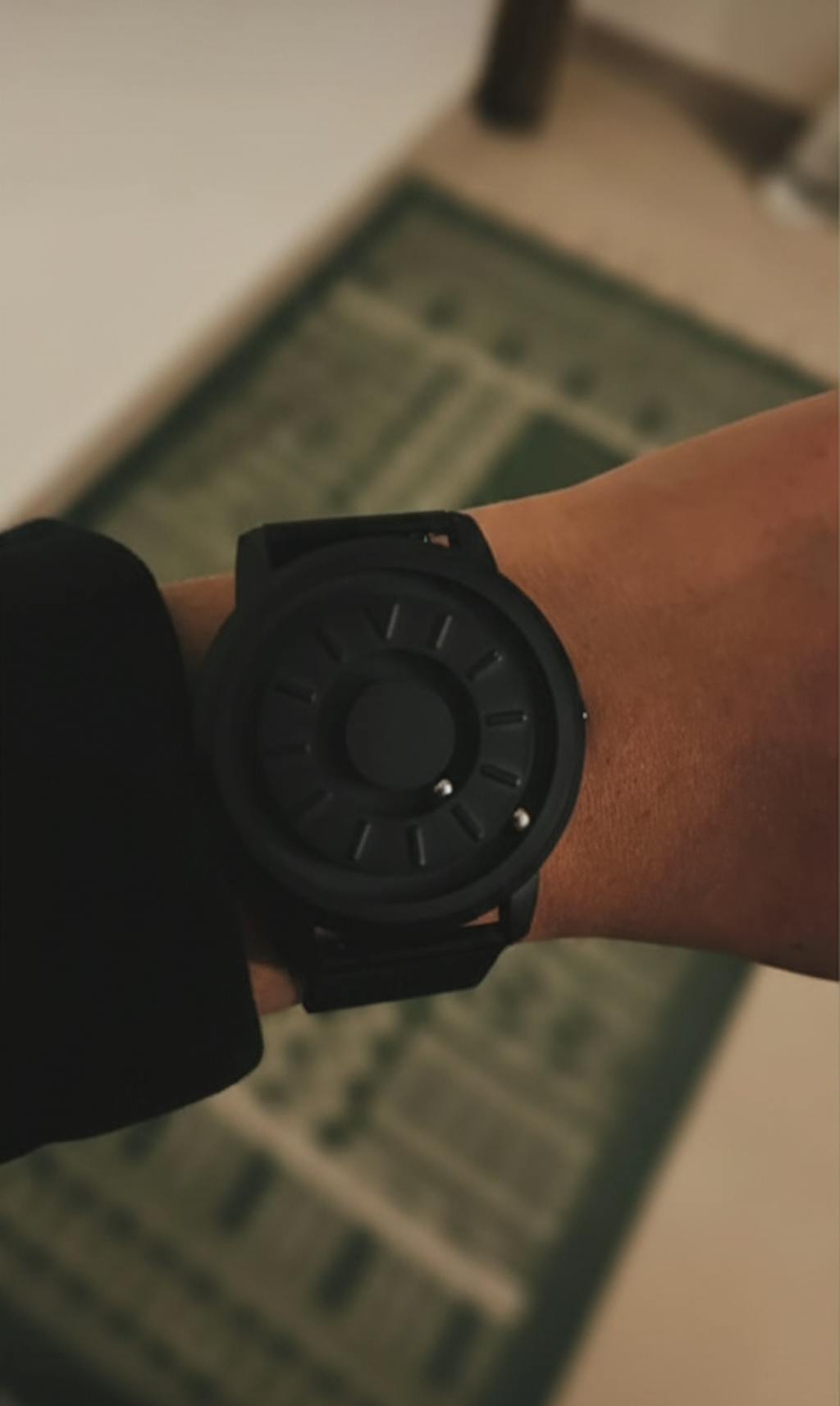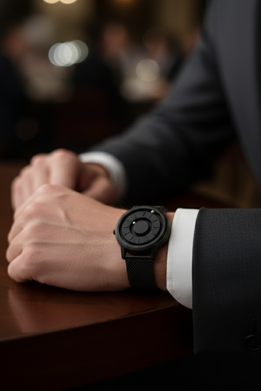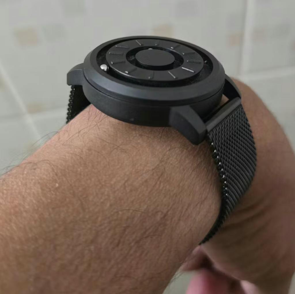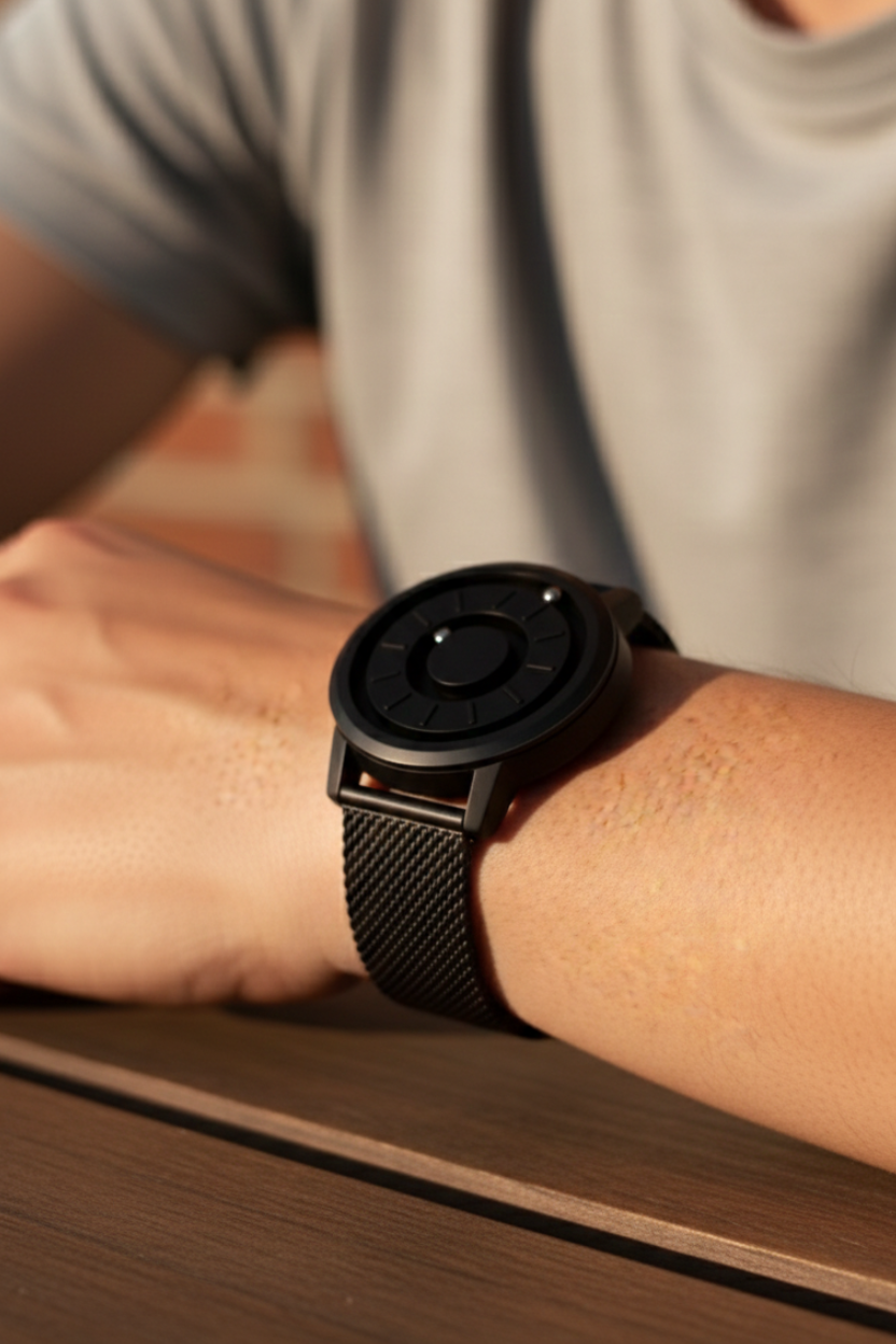 The watch has two metal spheres that circle the dial using magnetism. The outer ball replaces the hour hand, the inner ball replaces the minutes hand.