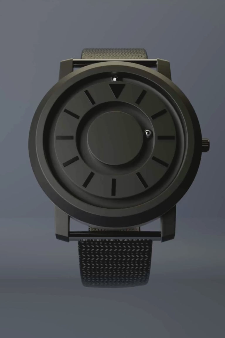The watch has two metal spheres that circle the dial using magnetism. The outer ball replaces the hour hand, the inner ball replaces the minutes hand.